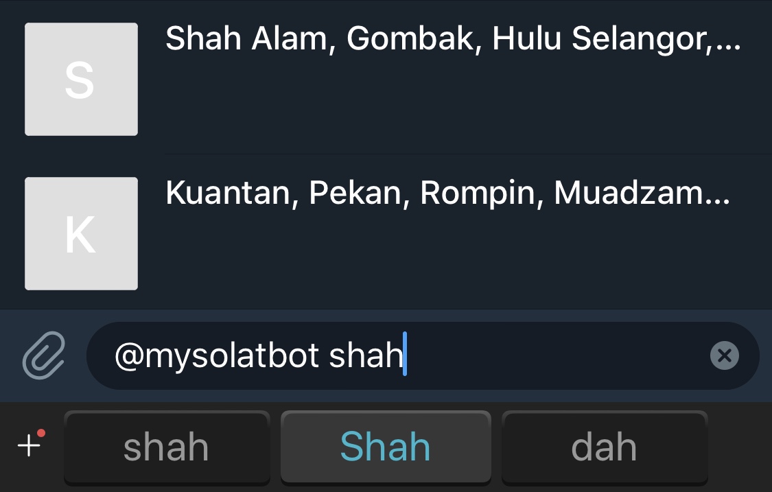 The bot is named mysolatbot. You can directly chat with the bot, add it to any group, supergroup, or channel, or use it inline by typing "@mysolatbot" and then three letters of an area.